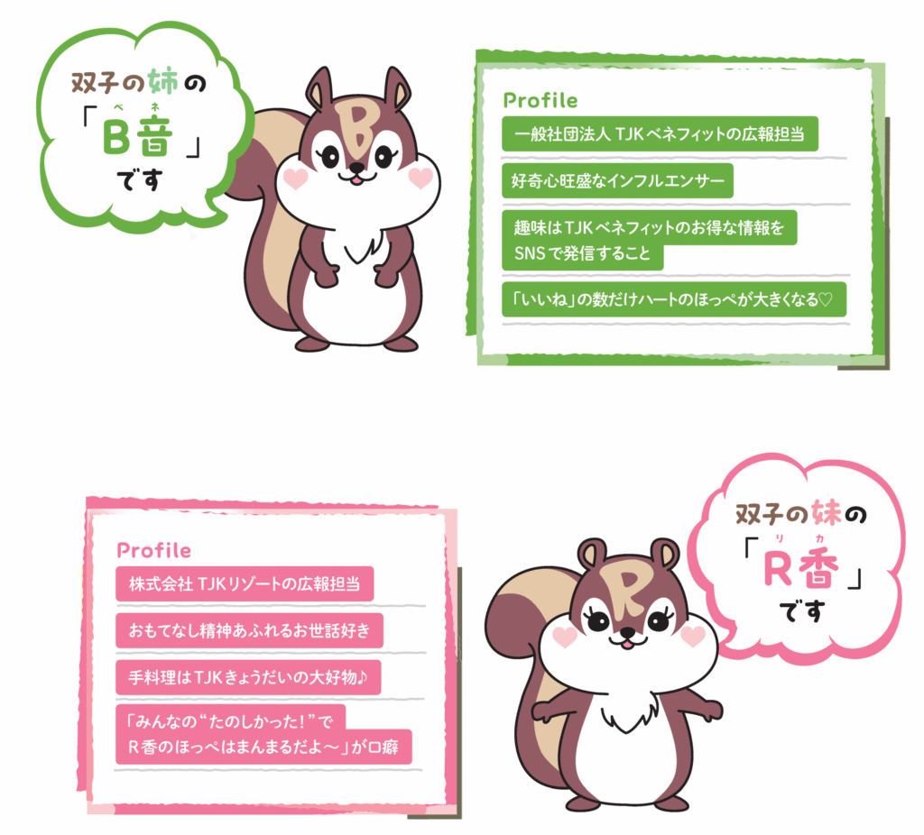 B音ちゃんはTJKベネフィットの、R香ちゃんはTJKリゾートの担当キャラクターです。