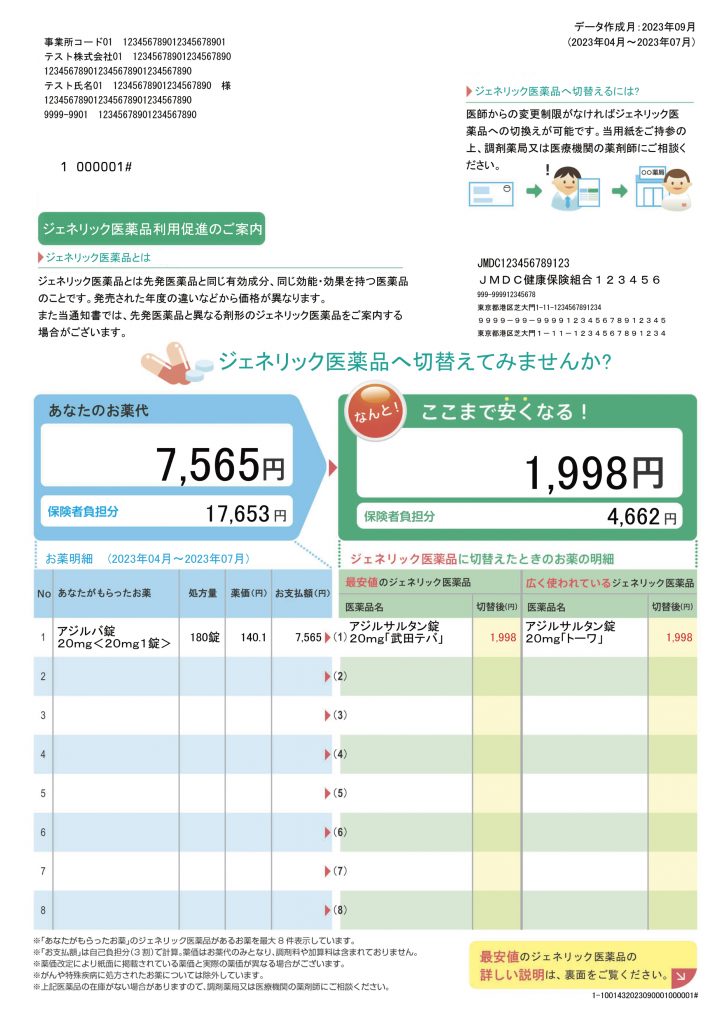 薬局や病院でお薬をもらっている方のなかで、ジェネリック医薬品に比較的切り替えやすく、かつ自己負担額の軽減が見込まれる方へジェネリック医薬品使用促進のお知らせを送付しています。