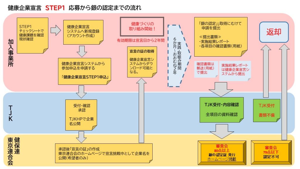 認定制度の中にある「健康企業宣言」はその1つです。企業全体で健康づくりに取り組むことを宣言し、一定の成果をあげた場合「健康優良企業認定」として認められる制度です。運営主体は「健康企業宣言推進協議会」で、TJK加入事業所は無料で参加することが可能です。