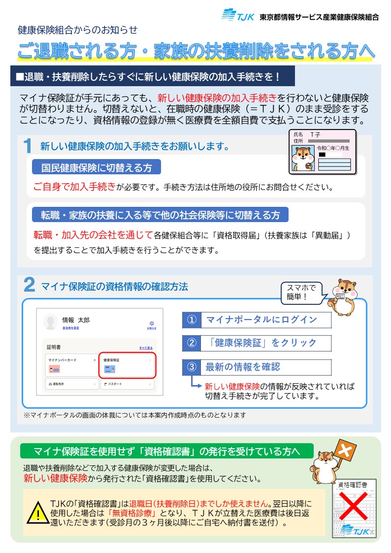 こちらのページでは健康保険ご担当者の方がご活用いただける動画・資料・ツールをまとめています。 目次 社員の方への配布用資料 退職する社員の方への案内資料【A】 退職する社員の方への案内資料【B】 お子様が生まれた社員の方へ 育児月刊誌一年間プレゼント 退職する社員の方へのご案内はこちら 説明動画 TJK事業紹介 -新入社員の方へのご案内にご利用くださいー ロングバージョン(14分53秒) ショートバージョン(6分47秒) 【アンケート】TJK事業紹介動画へのご意見はこちら 「健康経営・健康企業宣言」~認定までのポイントについて~【説明動画】算定基礎届・月額変更について【説明動画】 その他 【マイナンバー関連】個人番号転記ツール