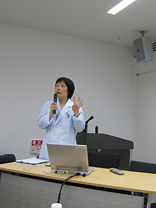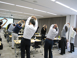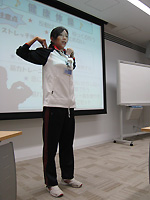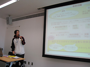 体験実技に先立ち、厚生労働省から出されている『健康づくりのための運動指針2006』(PDF)に基づいて、身体活動の目標などについての講義が行われました。