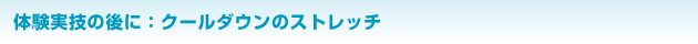 運動は、十分に体を温めてから行ったほうが脂肪燃焼率が高まるとのことで、ウォーミングアップとして以下のストレッチが行われました。 ストレッチを行うときのポイントとして、