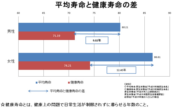 近年、よく耳にする「健康寿命」とは、健康上の問題で日常生活が制限されずに暮らせる年数のことをいいます。