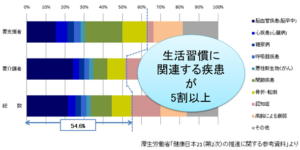 このグラフをみると、生活習慣病と関節疾患等、生活習慣に関連する疾患が5割以上を占めていることがわかります。これらはいずれも、防げる可能性のある疾患です。つまり、こうした病気の予防に努めることで、健康寿命を延ばすことは可能だというわけです。