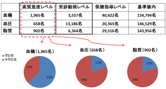 下の円グラフは、高緊急度レベルに該当した方の受診状況を示したものです。血糖や血圧、脂質は自覚症状が乏しいため、受診の必要性を実感しづらいこともあり、未受診の方がかなり多いというのが現状です。