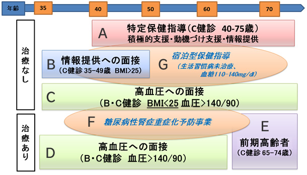 血圧だけではなく、その他の生活習慣病で薬を飲んでいる方、および前期高齢者(65~74歳)の方に対しては、重複受診をしない、服薬の徹底管理など、上手な病院受診や治療のコツなどを指導しています(E)。