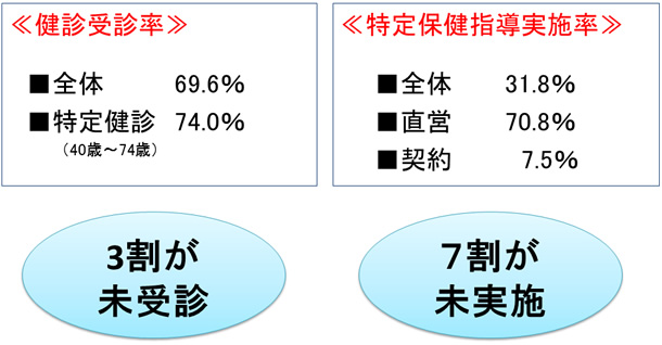 図(12)は、平成26年度の健診受診率、および特定保健指導実施率を示したものです。全体でみてみると、健診は3割、特定保健指導は7割の方が未受診となっています。