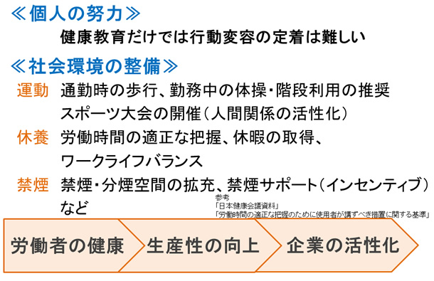 生活習慣を見直したり、改善に取り組んだりといったことは、個人レベルではなかなか定着しづらいものです。そのため、運動、休養、禁煙といった部分において社会環境を整備し、企業が個人の努力をサポートすることで、しっかりと定着につなげていただきたいと思います。