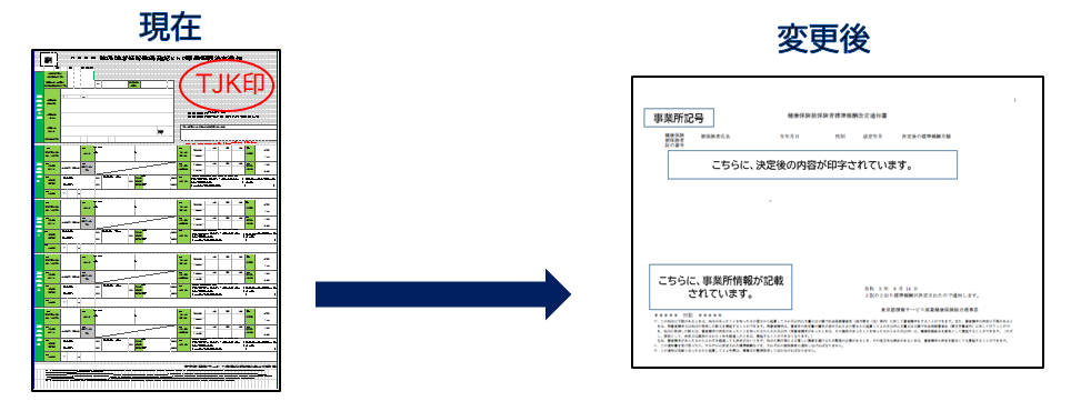 現在、用紙で当組合に届出書をご提出いただく際、「正」「副」をご用意いただき、「正」は健保への届書とし、「副」は組合で押印したものを、「確認・決定通知書」として事業所宛てに返送しておりますが、10月20日(水)送付分より、以下の7届につきましては「確認・決定通知書」をシステム出力によるものに変更いたします。
