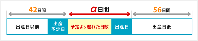 出産予定日以前42日間に、出産予定日から出産日までの日数(α日)を足した期間を産前期間とし、産後期間と合わせて請求期間を数えます。