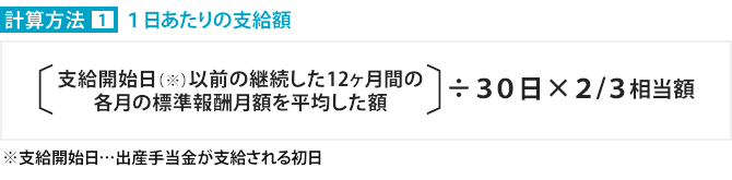 出産手当金はみなさまの標準報酬月額に基づき支給額を決定します。計算方法は1、2のうちいずれかあてはまるものを使用します。