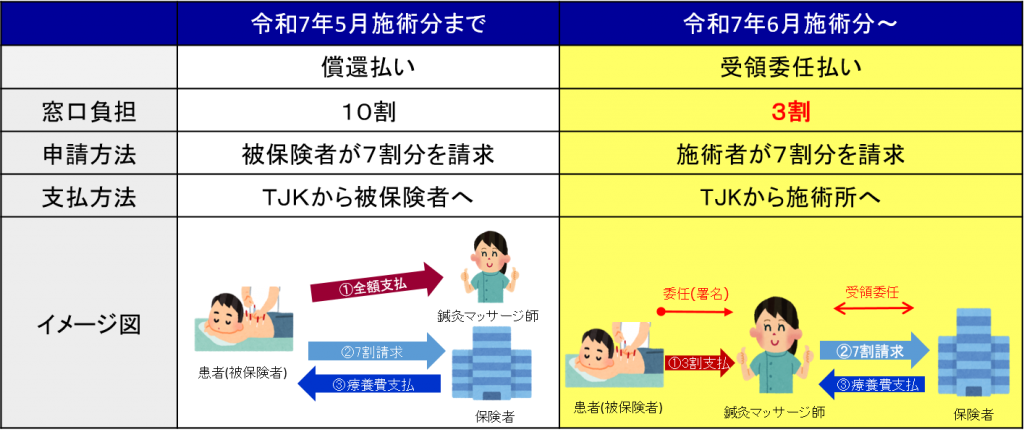 従来は施術費用を患者(被保険者等)が全額(10割)立て替えたのち、施術費用の一部を「療養費」として患者(被保険者)がTJKへ請求する償還払いの取り扱いをしておりました。しかし令和7年6月施術分より、患者(被保険者等)は一部負担金(3割もしくは2割)のみの支払いになり、患者(被保険者等)から受領委任を受けた施術者が療養費支給申請書を作成し、施術者が療養費をTJKから直接受け取る受領委任払いの取り扱いとなります。