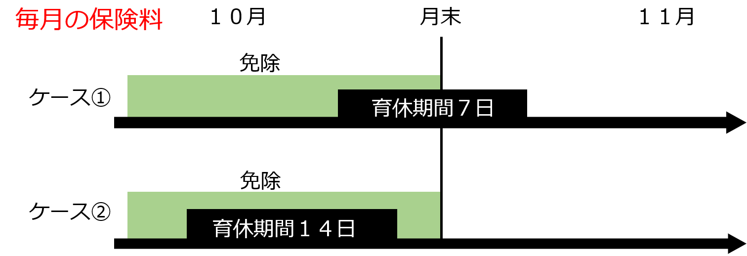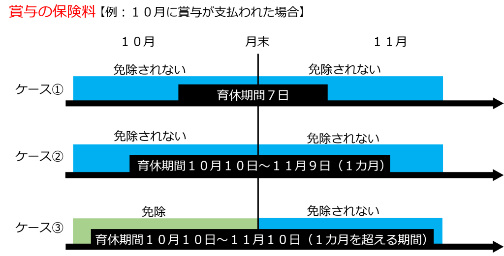 ケース①、②では、育児休業等の期間が1カ月を超えていないため、賞与保険料は免除されません。10月支払い賞与の社会保険料免除を受けるためには、1カ月を超える10月10日から11月10日までの育児休業を取得することが必要となります。