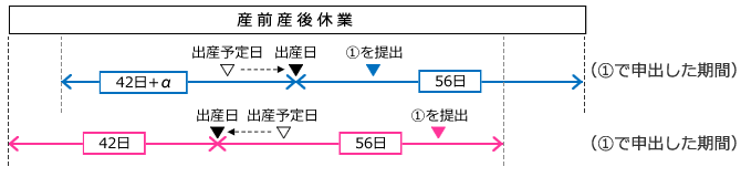 ① 出産後に『産前産後休業取得者申出書』を提出(出産予定日、出産日の両方を申出)