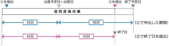 当初申出した①の産休終了予定年月日よりも前に産休を終了した場合は、②『産前産後休業取得者変更(終了)届』により終了日を届出(終了予定日通りに終了した場合は、届出は不要)
