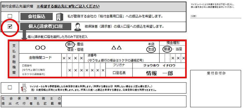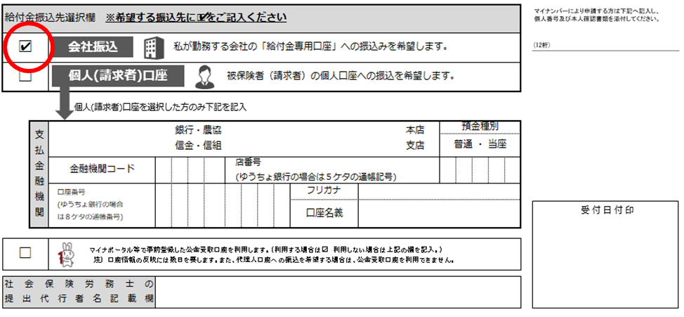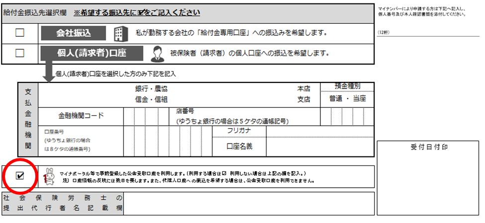 給付金請求書(申請書)には、下記の「給付金振込先選択欄」があります。 希望する振込先に記入してください。