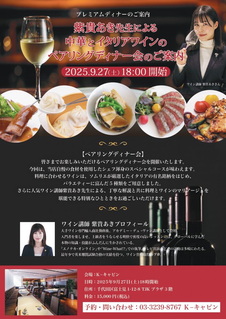 Kキャビンにて、中国料理とイタリアワインのペアリングディナーイベントを開催いたします。