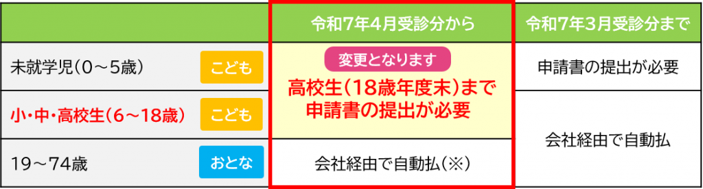 当組合では医療機関等の窓口で支払った医療費に対する「高額療養費・付加金」を会社経由で自動払いしております(一部除く)が、近年の全国的な「こども医療費助成」の対象年齢拡大を受け、令和7年4月受診分から小・中・高校生は「高額療養費・付加金」に該当する場合、申請書の提出が必要です。