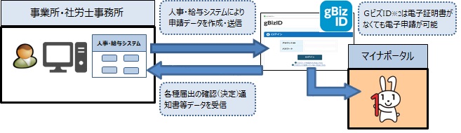 マイナポータルへの申請データの送信はご利用の人事・給与システムからAPI連携によりGビズID・パスワードで認証の上、直接マイナポータルに送信します。ご利用の人事・給与システムにより仕様や操作方法が異なりますので、詳細は、ご利用の人事・給与システム事業者にお問い合わせください。