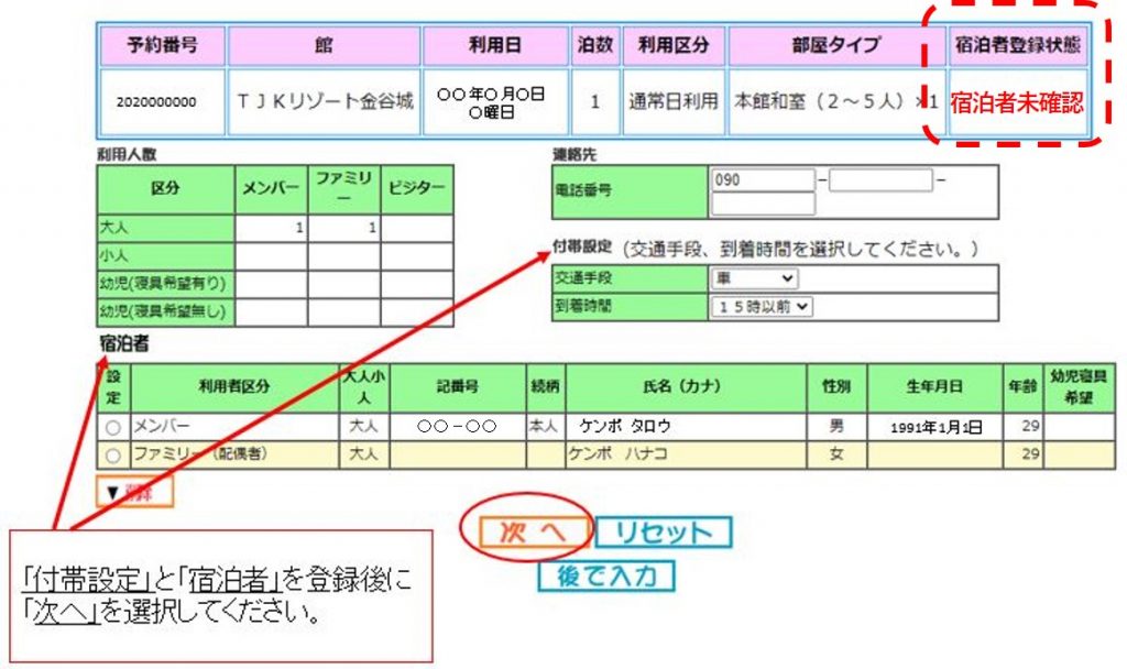 ④ 「付帯設定」と「宿泊者」を登録後に、「次へ」を選択してください。