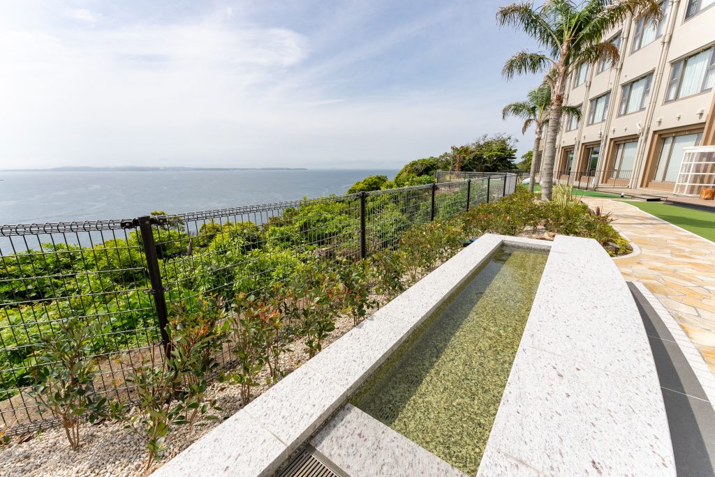 本館海側の屋外に位置するパターゴルフ場を全面改修し、南国リゾートの趣を感じる広場へ生まれ変わりました。金谷城温泉をひいた足湯に浸かりながら、海を眺めることができます。
