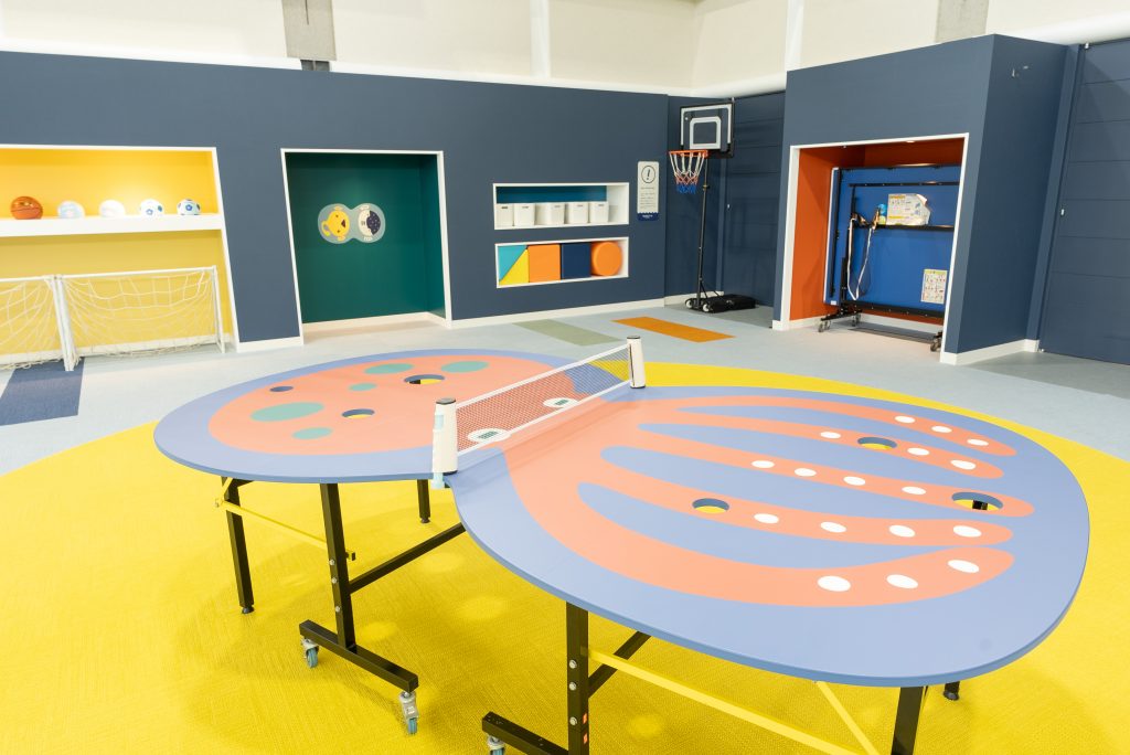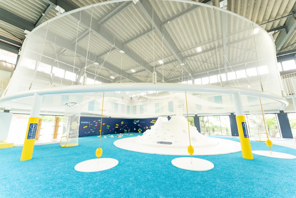 金谷の海をモチーフに、大人も子どもも愉しく生き生き遊べる空間が誕生しました。大きなネット遊具や卓球、バドミントンを楽しめるほか、小さなお子様が遊べるエリアも。