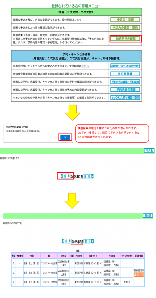 なお、ホームページ上の「登録者専用メニュー」の「抽選結果の確認」からも内容をご確認いただけますので、併せましてご確認をお願いいたします。