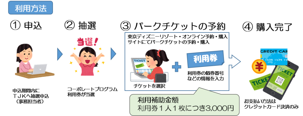 東京ディズニーランドまたは 東京ディズニーシのパークチケットを各自でご予約・ご購入いただく際に、「利用券」をご利用いただくことで、パークチケット料金から補助金額を差し引いた料金でご購入いただけます。
