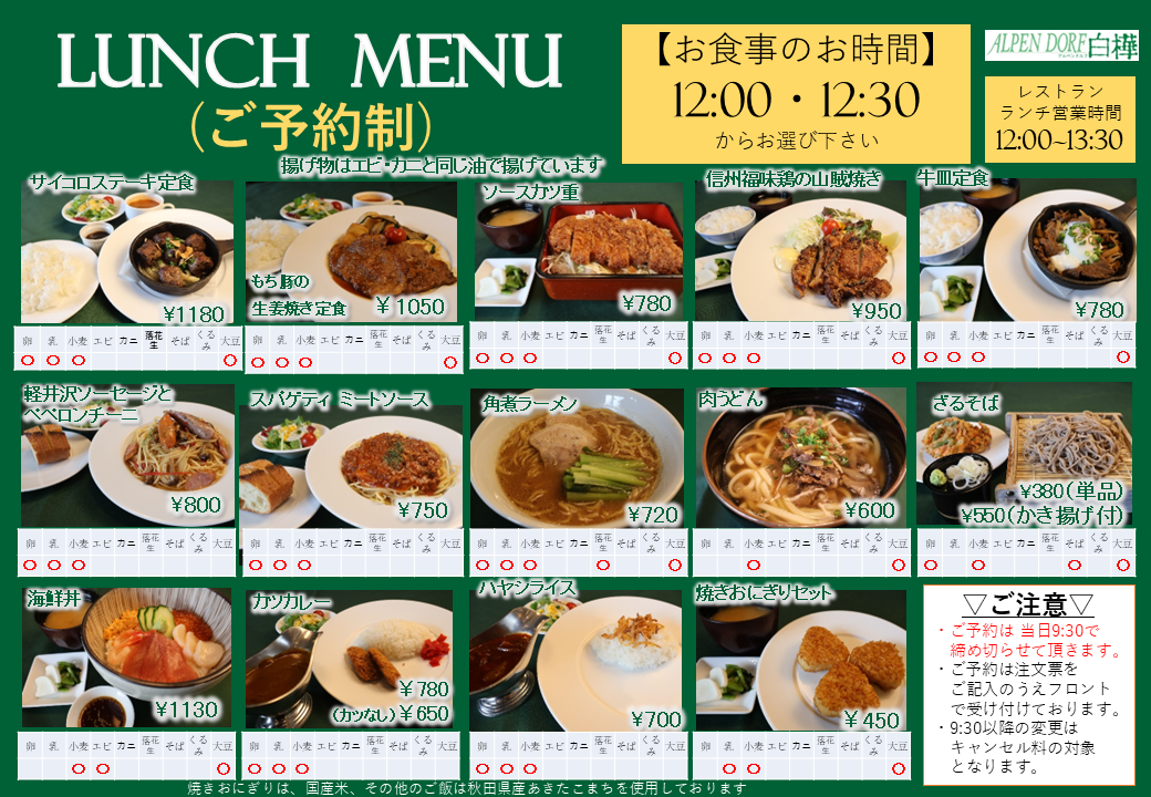 ご予約は当日9時30分までにアルペンドルフ白樺フロントへ