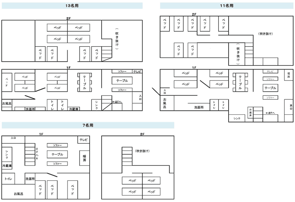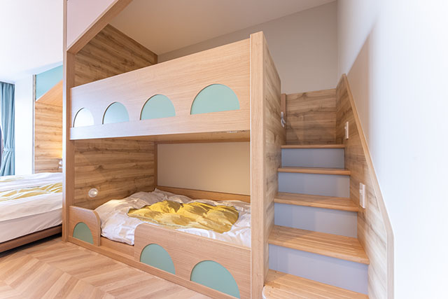 ※二段ベッド+セミダブルベッド2台。5名利用時はセミダブルベッド2台をくっつけて3名でご利用ください。