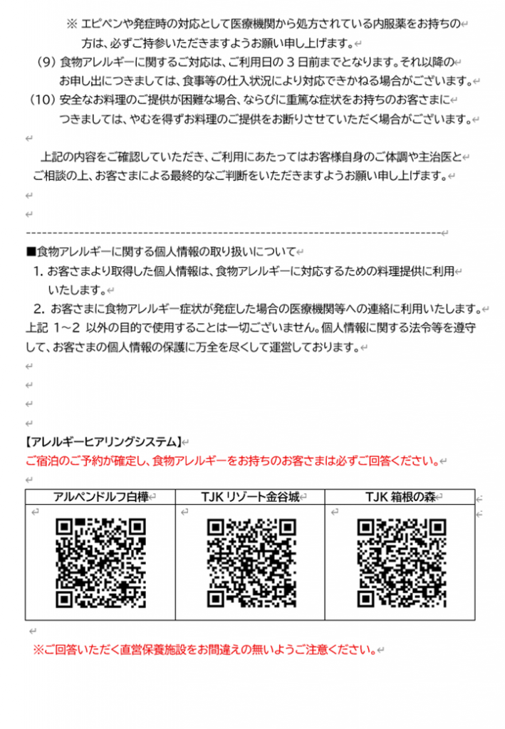 TJK直営保養所では、食物アレルギーをお持ちのお客さまがお食事をお楽しみいただけますよう、以下の内容でご希望を承っております。
