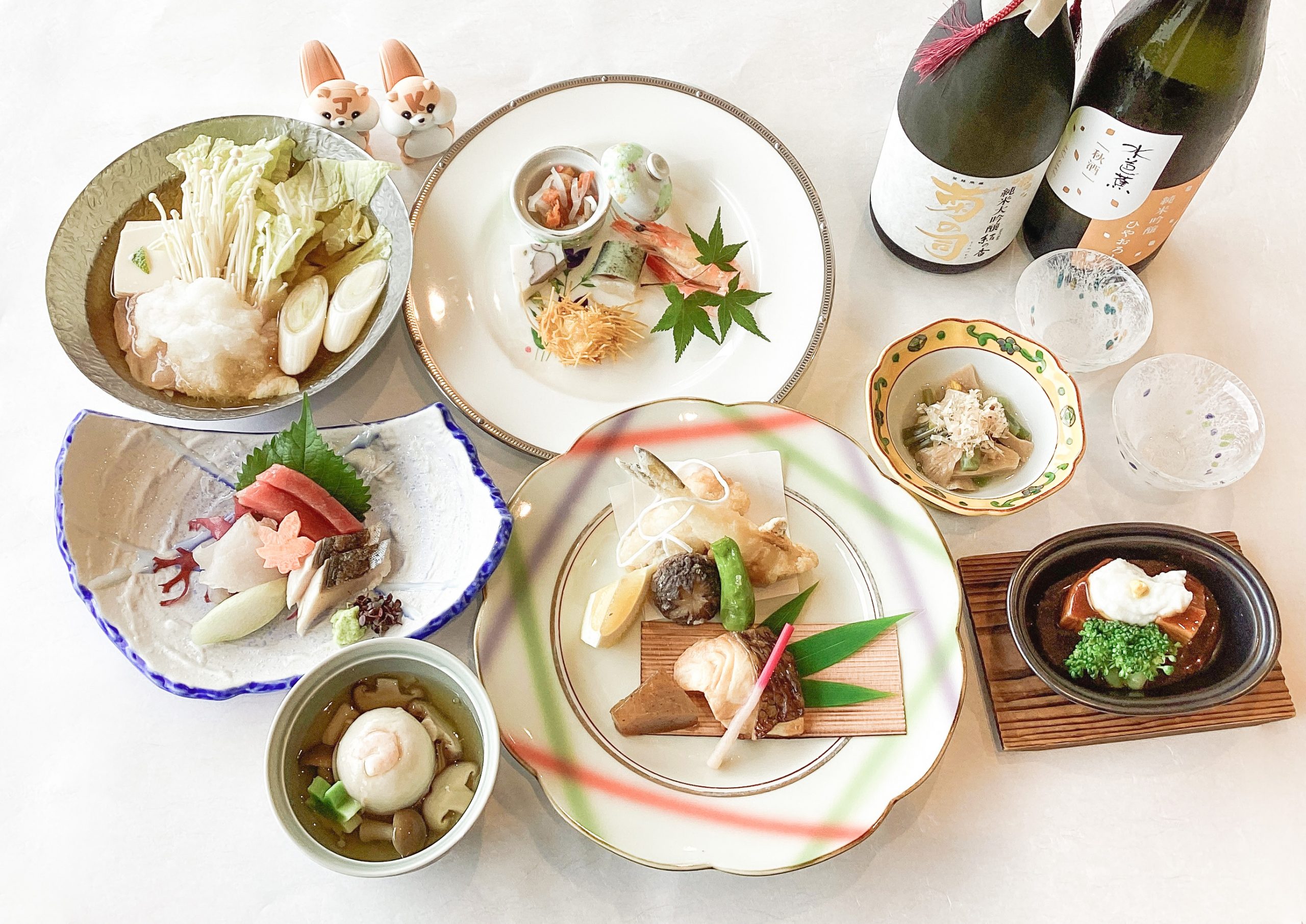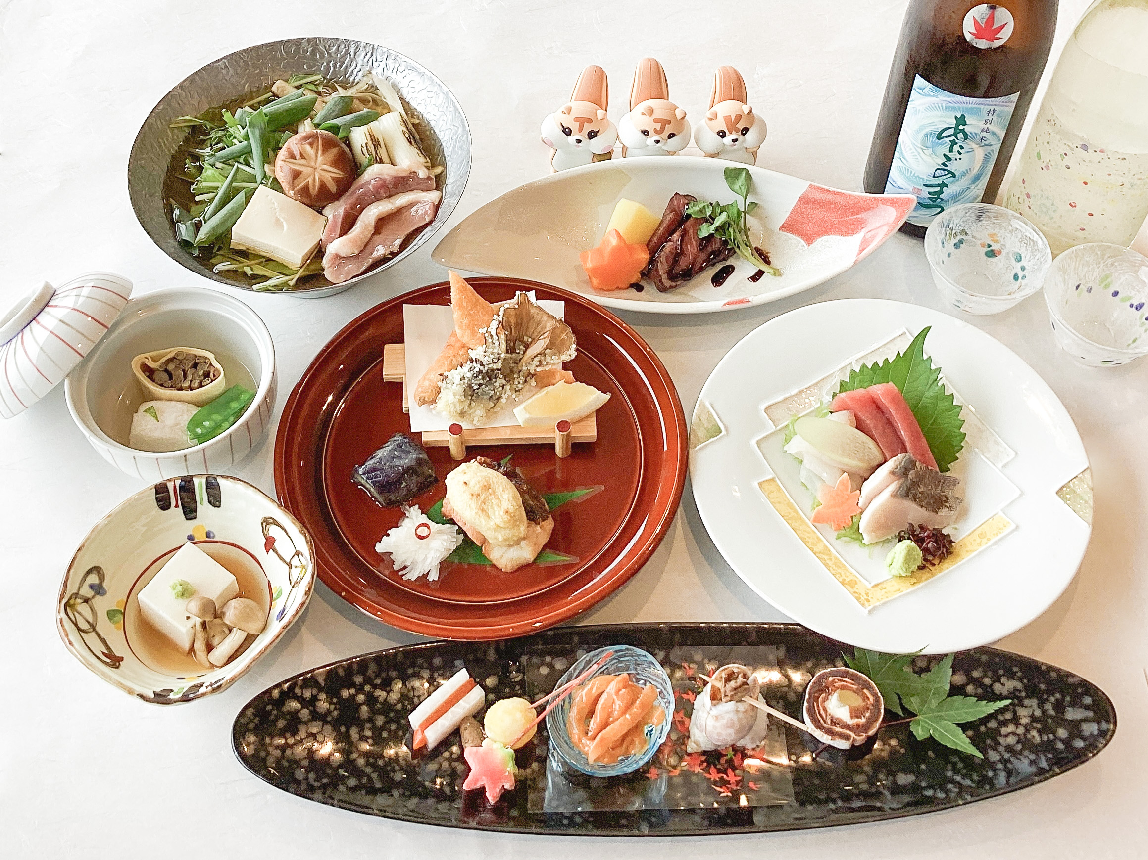 | 前 菜 | 烏賊白味噌山葵和え 月光柿 秋松葉揚げ 唐墨大根 梅貝磯煮 |