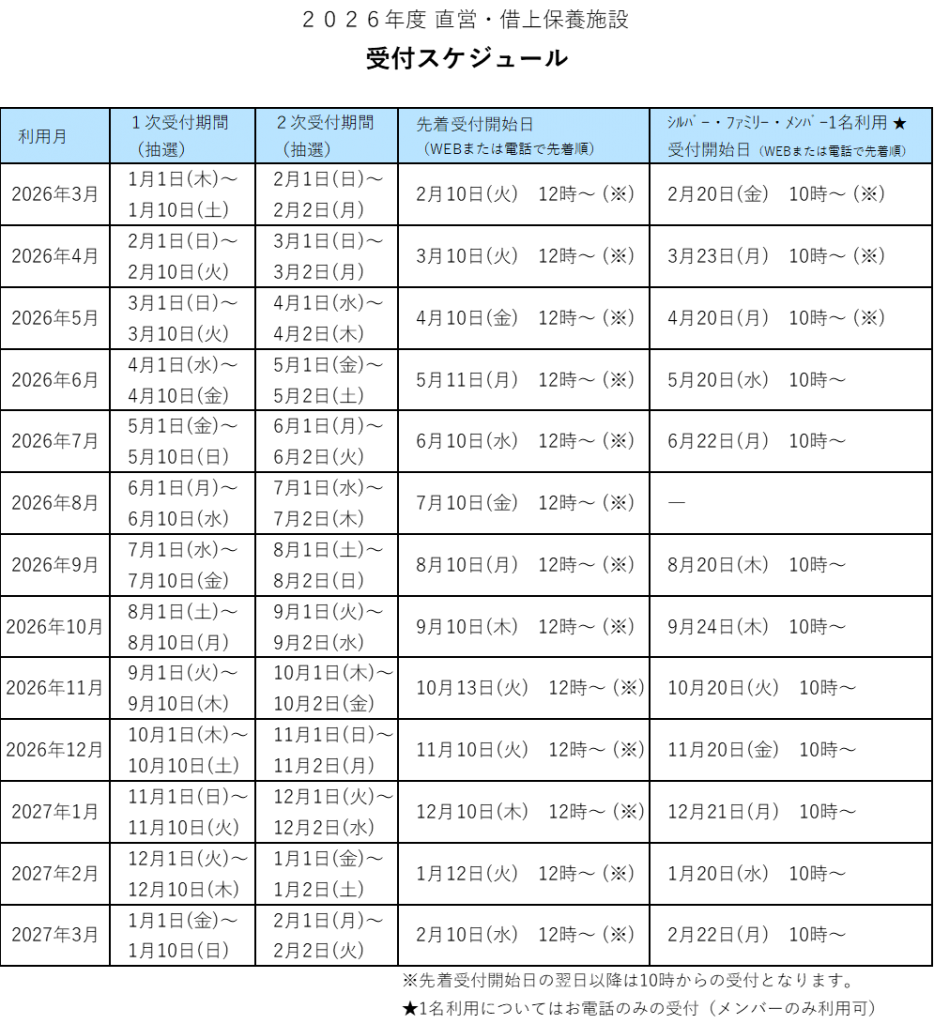 ・・・利用月前月の10日(休日の場合は翌営業日)。 - 「シルバー利用」「ファミリー利用」「メンバー1名利用」受付開始日