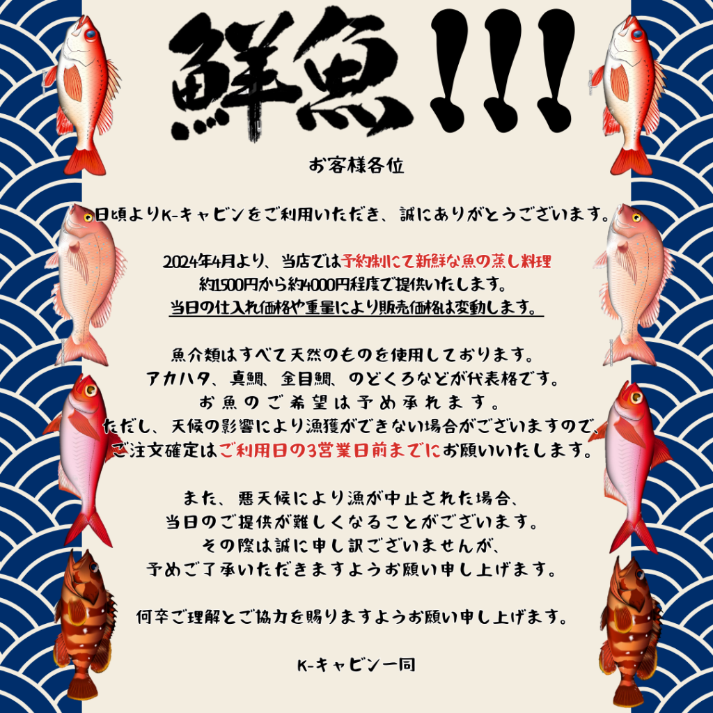 新鮮な天然魚をまるごと蒸し上げ、本格中国料理の味付けでご用意いたします。 魚の種類や価格はご相談ください。 ご予約をお忘れなく! (ご利用日の3営業日前まで!(土・祝日を除く))