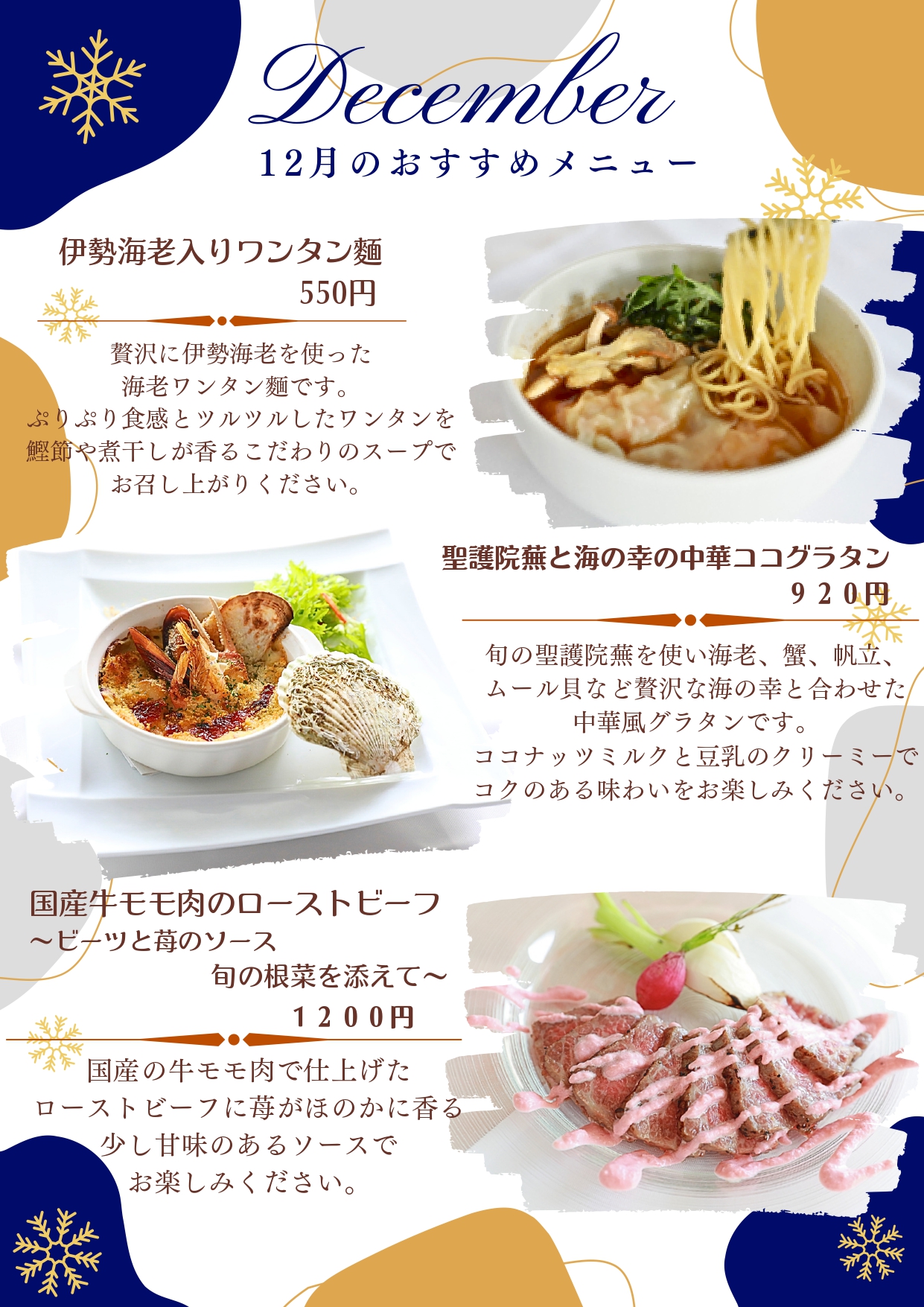 今年のクリスマスディナーは、Kキャビンで中国料理を楽しんでみてはいかかでしょうか。